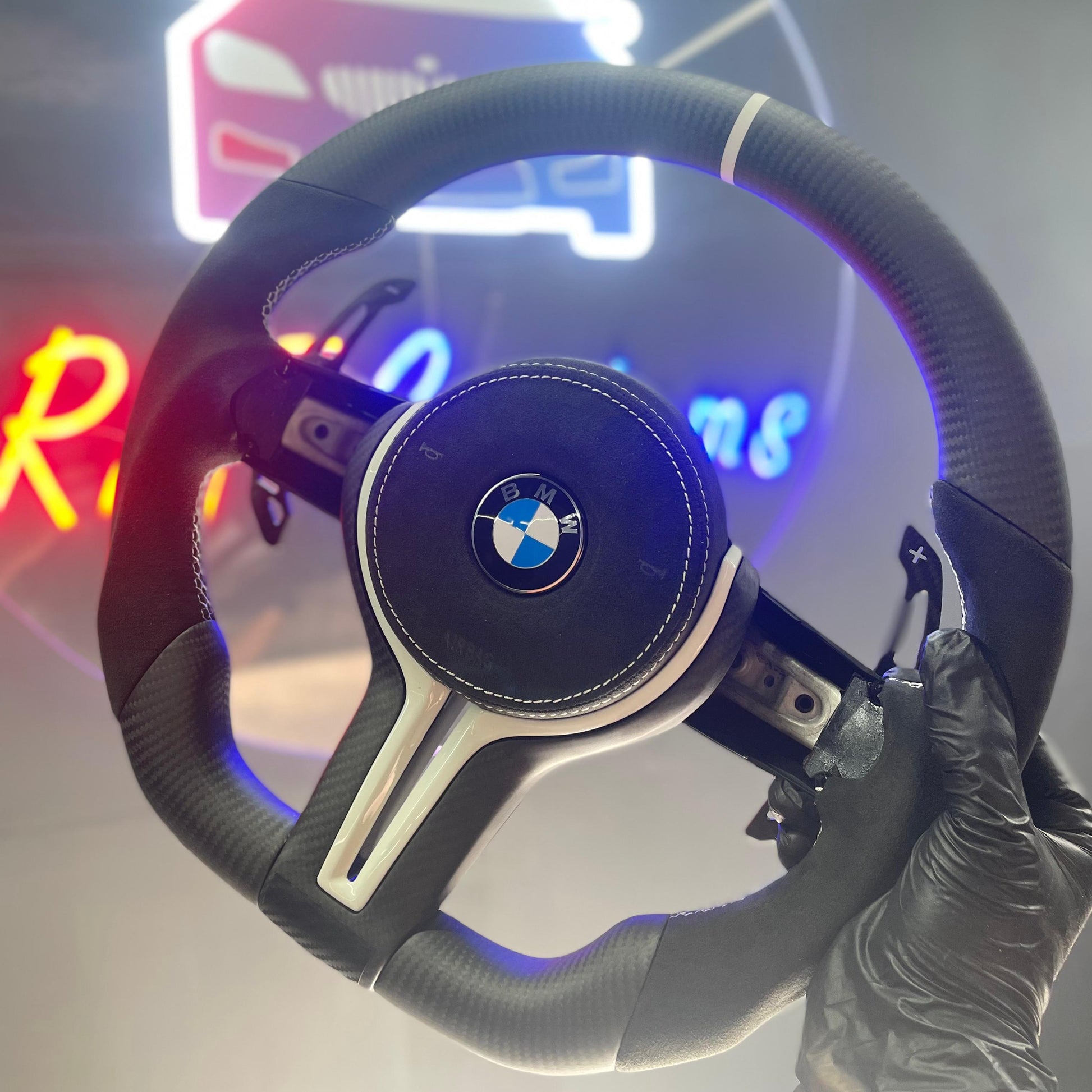 Experience custom BMW Carbon Steering Wheels, featuring Alcantara / Perforated leather, hand stitching, magnetic paddle shifters and decals for a stunning finish. Our redesigned wheels include a flat bottom and adjustable custom ergonomic grip for maximum comfort and style.